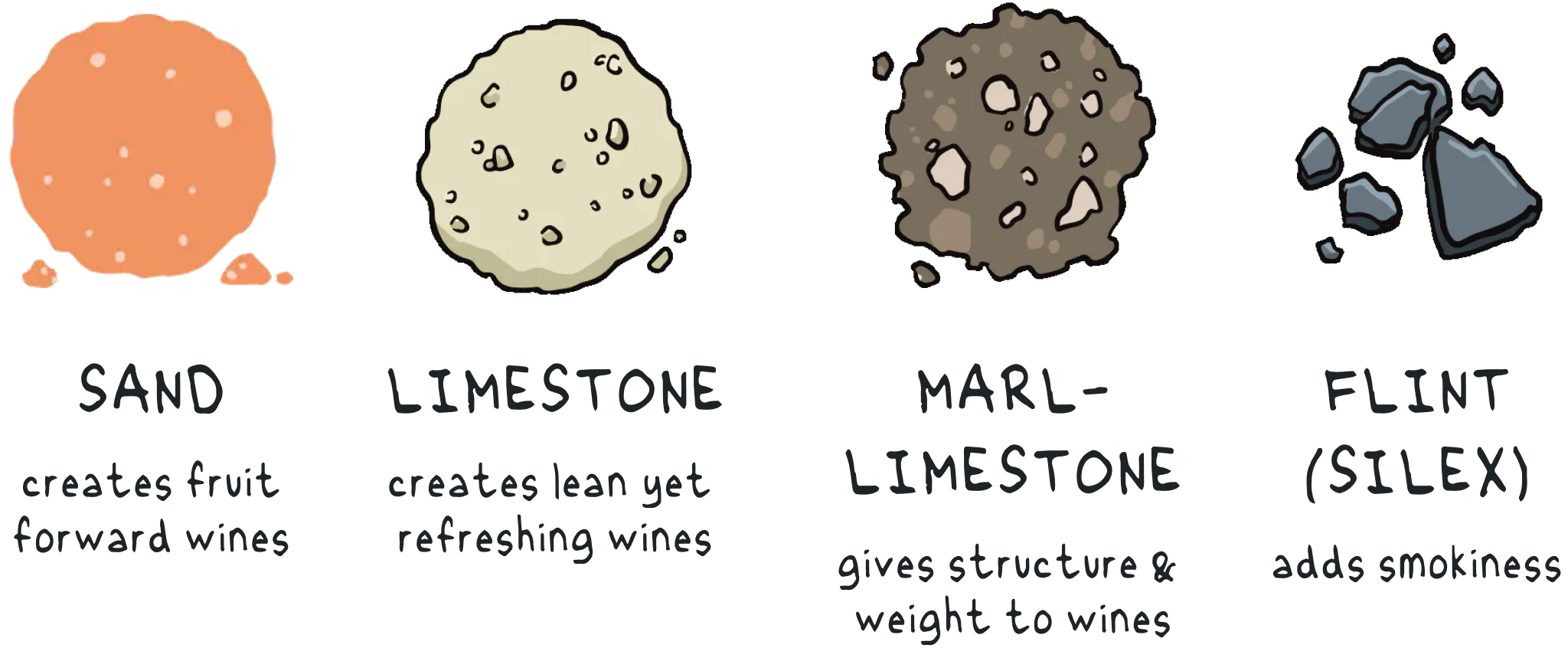 Four main soil types can be found: Flint (silex), which can add smokiness; Marl-Limestone which gives structure and weight to wines; Limestone, which creates lean yet refreshing wines; and Sand, which creates fruit forward wines.