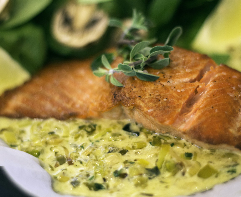 A very classic preparation of Salmon is one that is perfectly roasted or poached and topped with something creamy, lemony and herbal. Sauces for this style include béarnaise, lemon dill cream sauce, dill, and cucumber yogurt sauce or creamy horseradish and caper sauce.