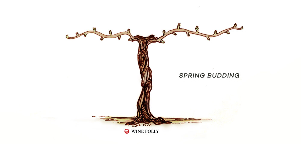 After the buds break in early spring, they continue to grow. Some viticulturists prune the downward-facing shoots to ensure that all the shoots grow upward, reducing the potential crop size. This strategy involves reducing the quantity to increase quality because vines that produce limited numbers of grapes produce more concentrated grapes.