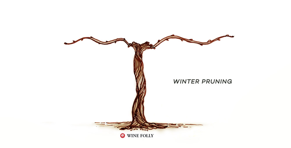 One of the most expensive and most important activities in the vineyard (besides harvest) is winter pruning. The pruner cuts back the prior year’s canes and chooses the best canes to grow new shoots. The pruning system used is determined during the vineyard design, but it is possible to change the way vines are trained from season to season if vigor (over or underproduction) is an issue.
