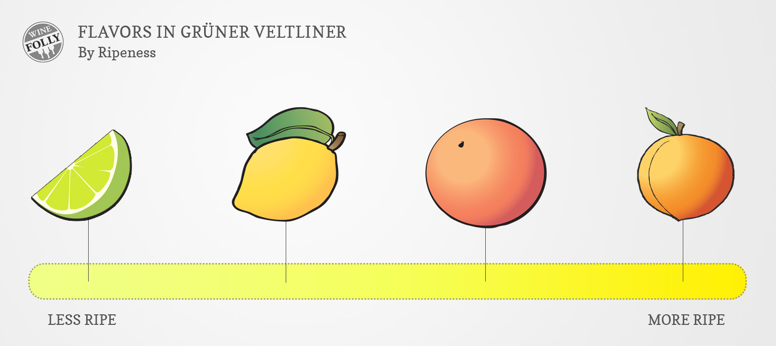 The primary fruit flavors in Grüner Veltliner are lime, lemon and grapefruit. There is also a green and herbaceous flavor that is often described as white pepper. However, what makes Grüner Veltliner wine so unique is its signature vein of acidity that explodes in your mouth like pop rocks. More affordable Grüner Veltliner (around the $10-20 mark) loses this acid burst quickly after every sip, but high quality Grüner wine will have a delicate tingly aftertaste.