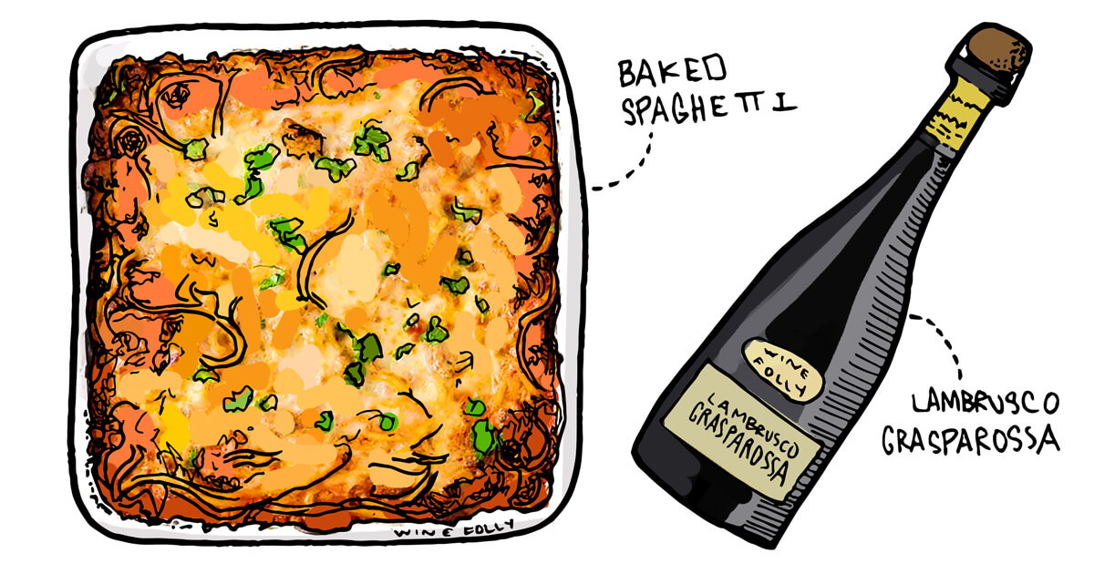 - Why it works:Lambrusco Grasparossa is known for darker fruit flavor, along with stronger tannins: both of which are solid choices for a tomato-based sauce that you’ll usually find in baked spaghetti.