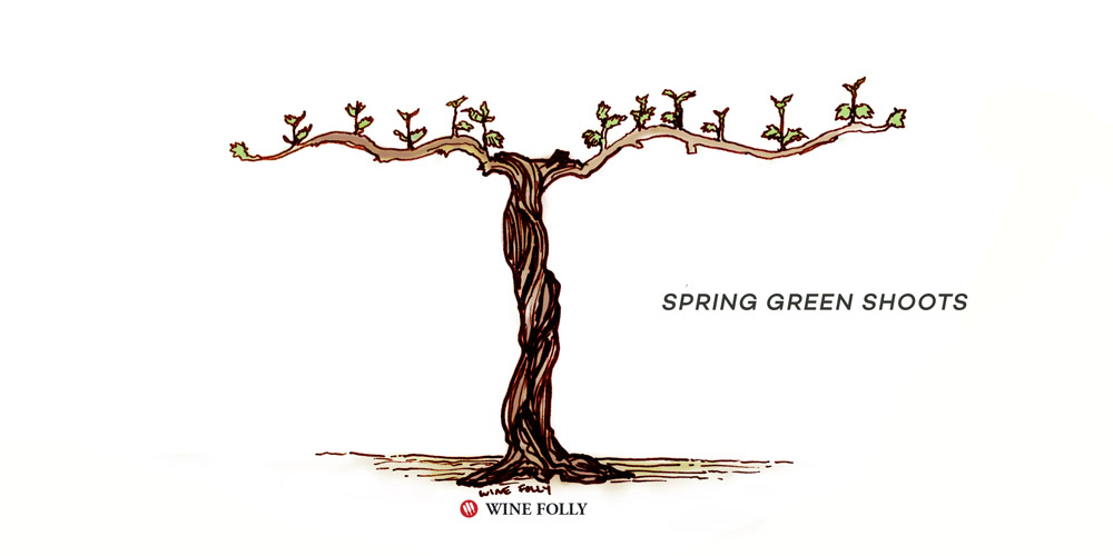 After the buds break in early spring, they continue to grow. Some viticulturists prune the downward-facing shoots to ensure that all the shoots grow upward, reducing the potential crop size. This strategy involves reducing the quantity to increase quality because vines that produce limited numbers of grapes produce more concentrated grapes.