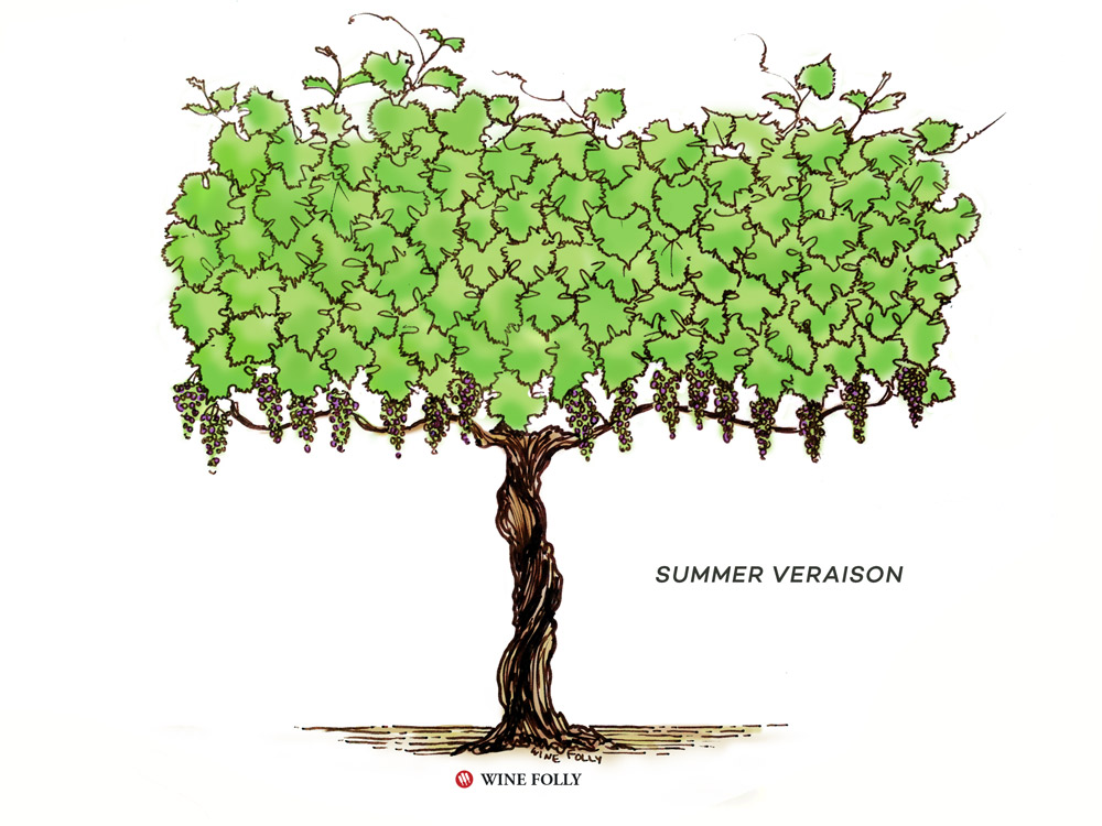 In mid to late summer, the green berries start to change color and ripen. This period is called vérasion (“verre-ray-shun”), and it’s the most beautiful time of the year in a vineyard when the berries change colors from a vegetal green to yellow, pink, red or purple. Just before vérasion begins, some winegrowers do green harvesting, wherein a little excess weight is removed from the vines (the superficial grape bunches) so that the vines can focus their energy on their real friends. Er, grapes focus on their remaining grapes.