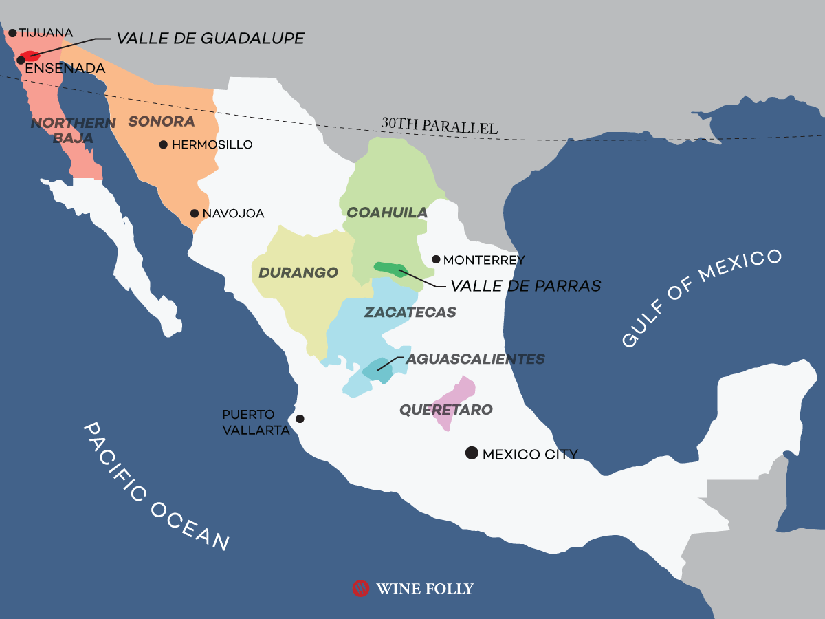 The vast majority of wine production (about 85%) occurs in the state of Baja California, which is just a smidgen north of the 30° latitude line. The region benefits from the cooling breezes of the Pacific Ocean.