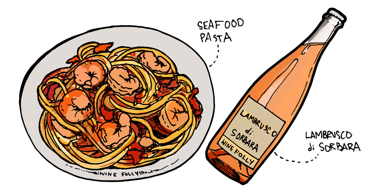 - Why it works: A spicy red sauce and shrimp are too rich for whites but too seafood-buttery for a tannic red: we need rosé!